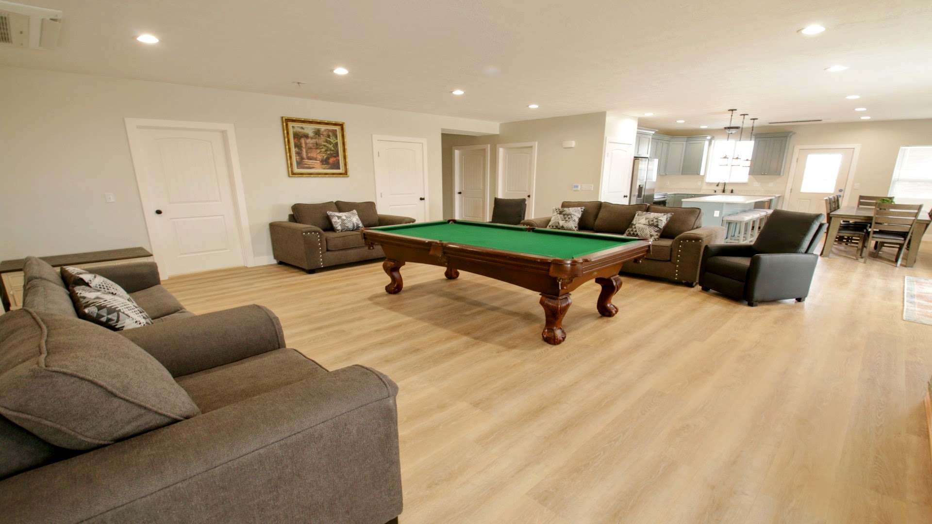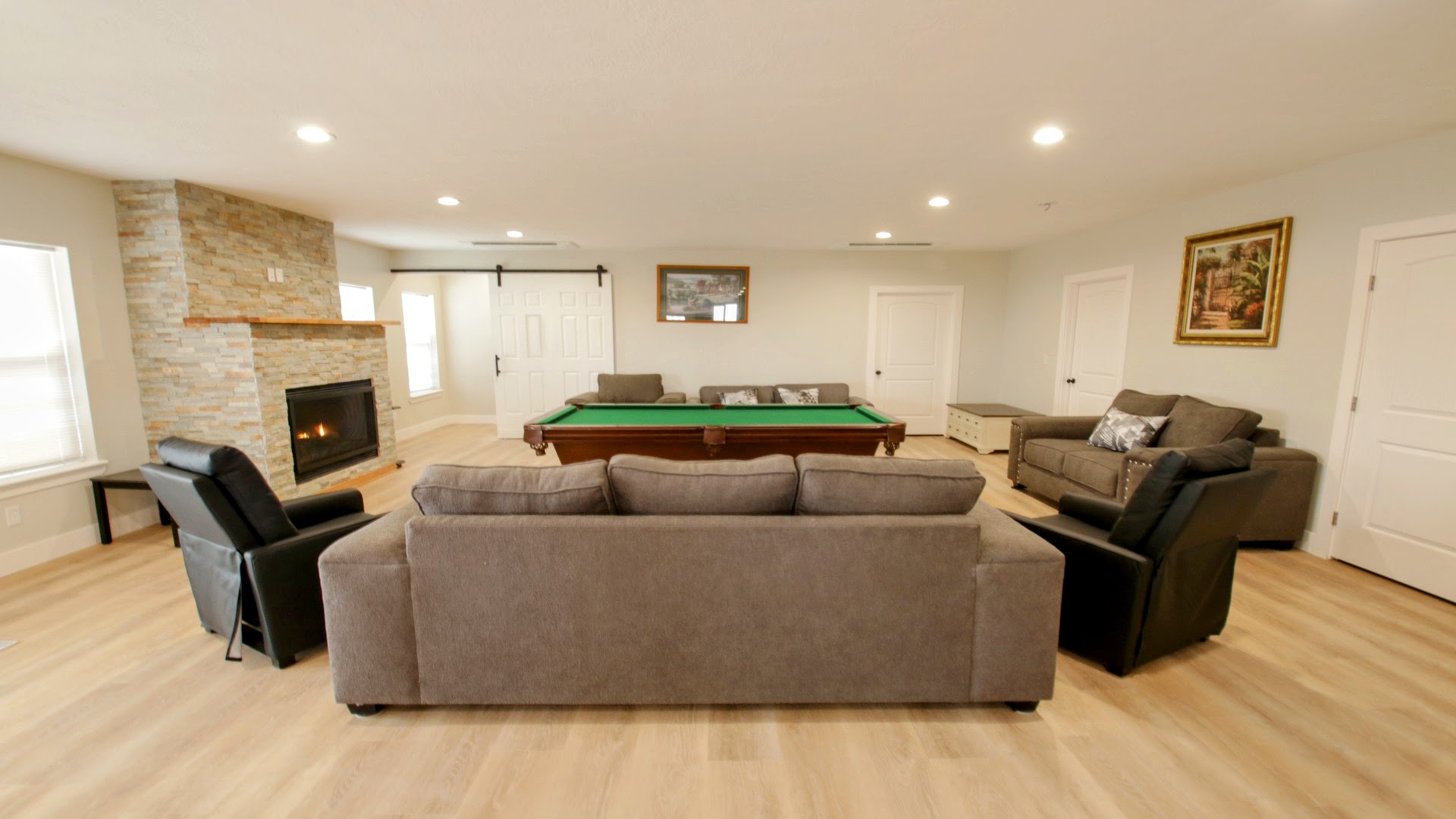 Lower level: Expansive game room with pool table, second full kitchen, cozy fireplace