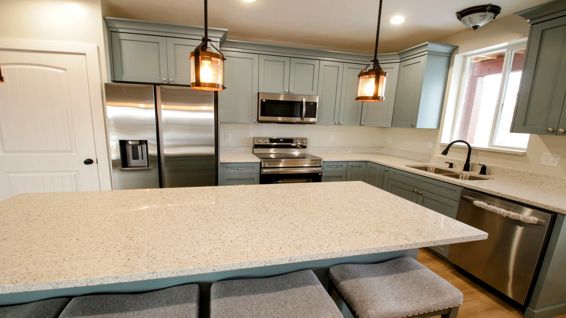 Stunning sage-green shaker cabinets with crown molding