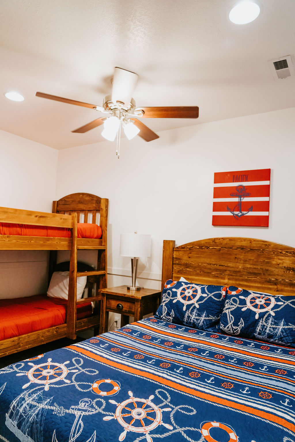 Bedroom #6 (Lower Level) - 1 Queen bed, 2 Twin-over-Twin bunks